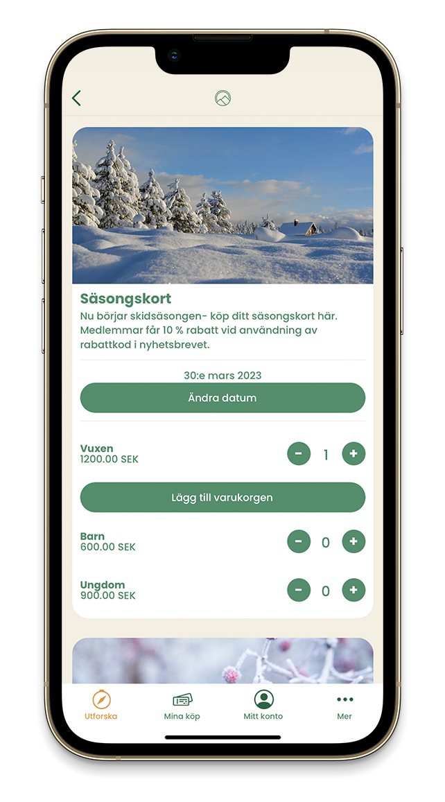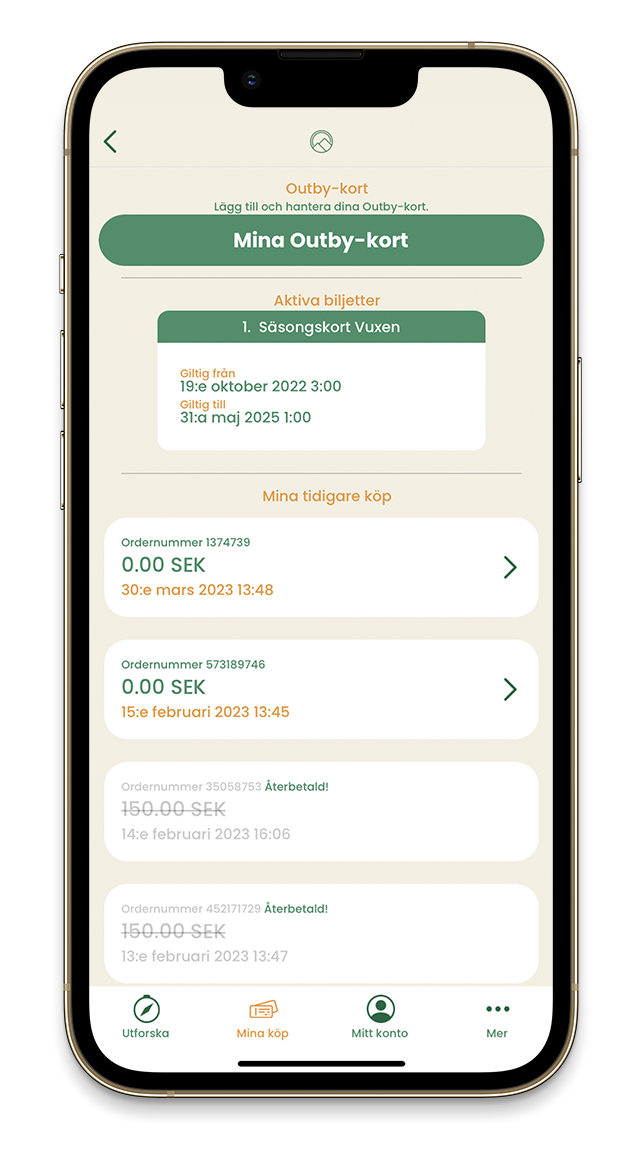 Sälj era produkter i både appen och webbshoppen – allt från spårkort till boenden. Här kan ni även uppdatera när era spår och leder senast preparerades. Appen är det smidigaste sättet för gästen att köpa eller boka, samt samla sina köp och digitala Outby-kort.
